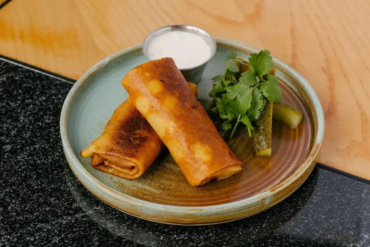 Блины с фаршем из филе щуки с обжаренным луком на сливочном масле. Подаются с солёным огурцом, свежей кинзой и нежной сметаной.