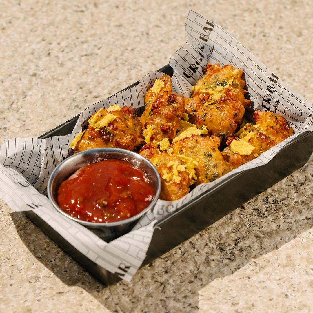 Оригинальное блюдо на мексиканский мотив, в сырно-кукурузной панировке, в дополнении пикантного соуса сальса, украшается начосами.