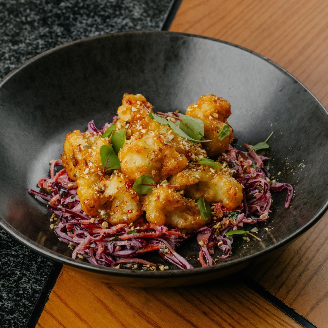 Цветная капуста в легком темпурном кляре с пикантным соусом, салатом коул слоу на веганском майонезе, украшенная дробленными семечками тыквы и трюфельным маслом.