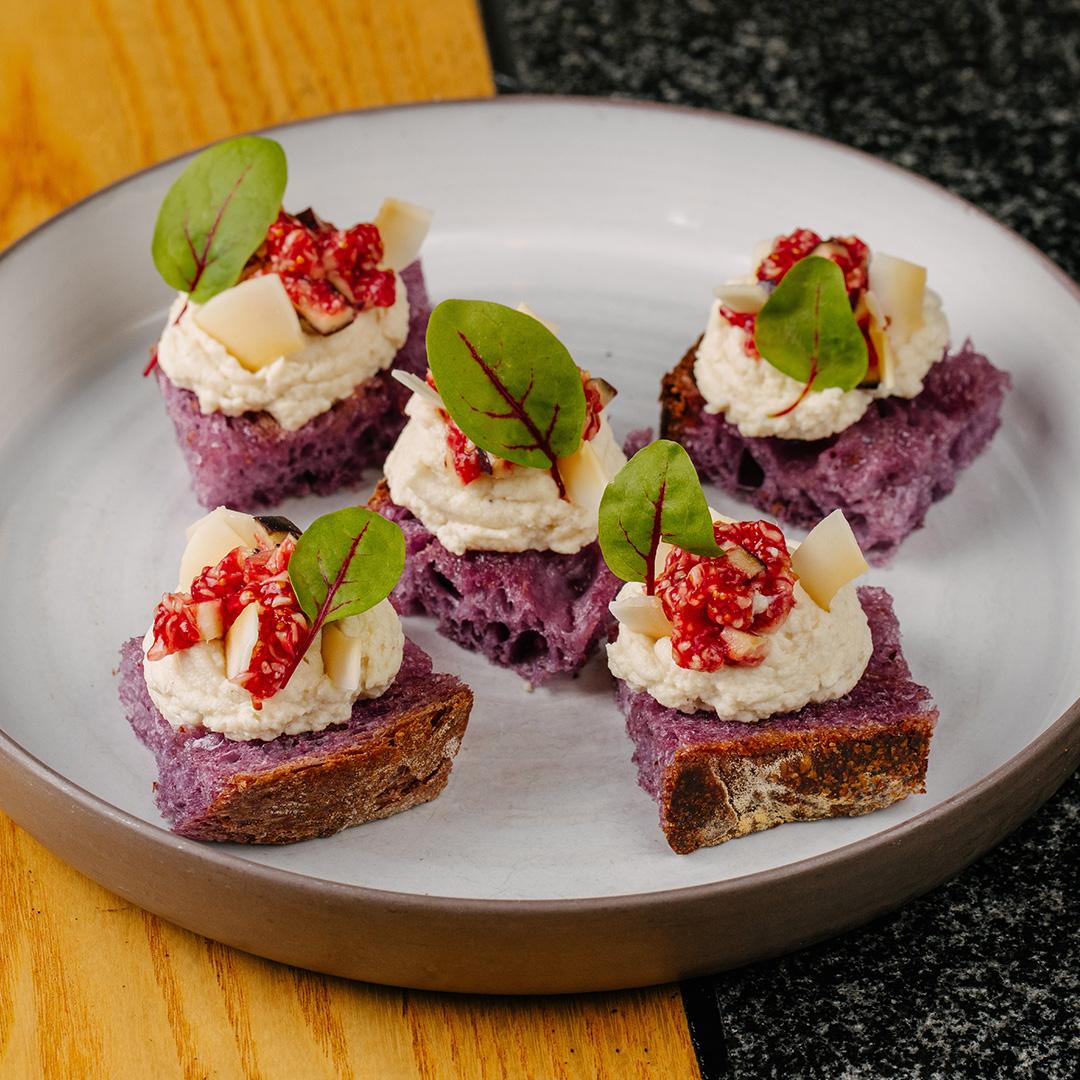 Нежный куриный паштет на лавандовом хлебе, с инжиром и кокосовыми чипсами, посыпается сыром пармезан.