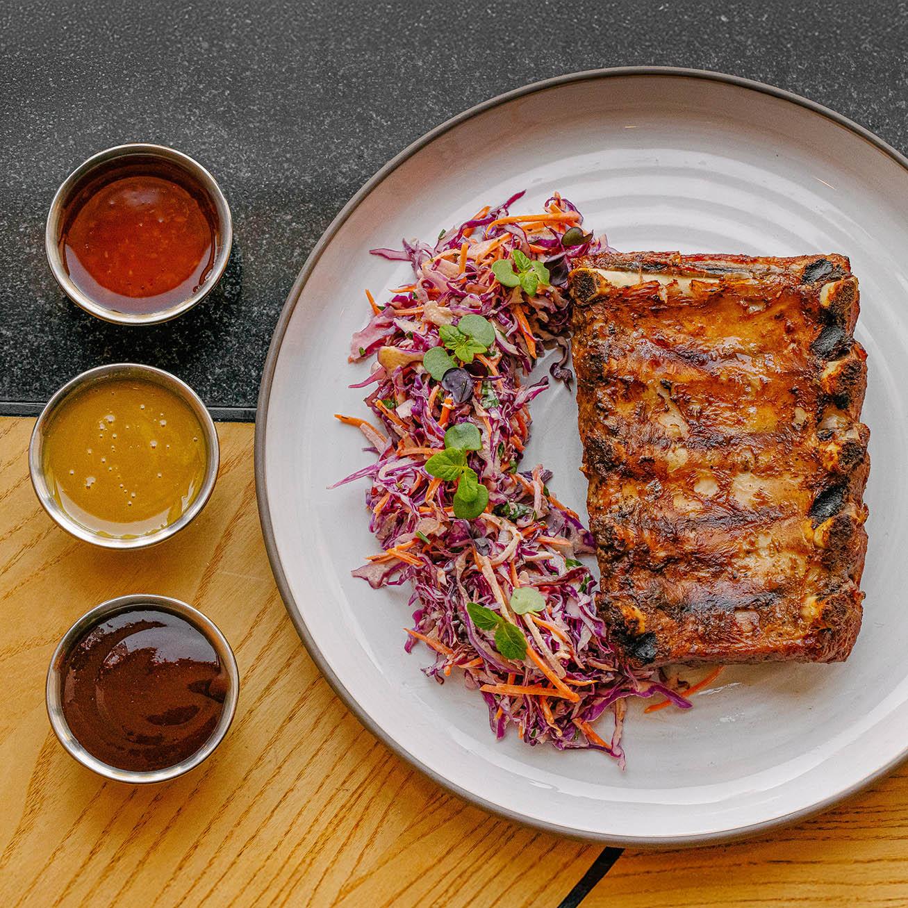 Нежные свиные ребра обжаренные на хоспере. Подаются с салатом коул-слоу и соусом Сладкий Чили