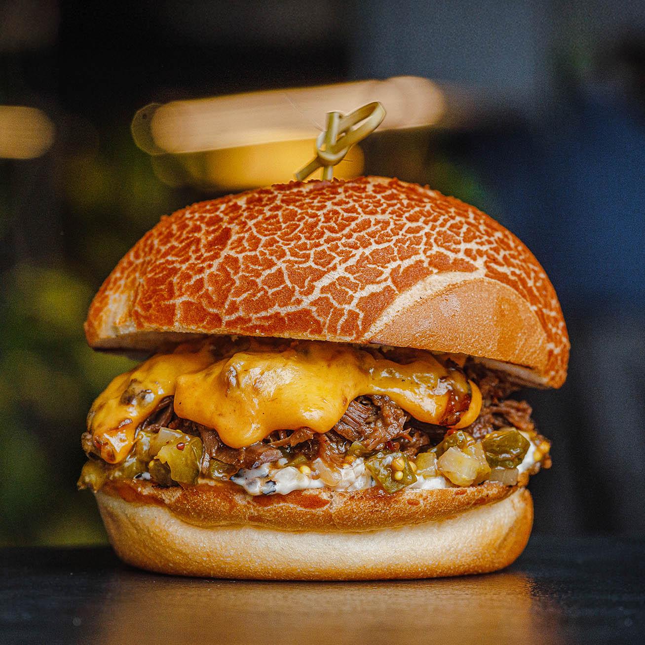 Бургер со рваной говядиной, соусом из огурцов и оливок, с сыром чеддер