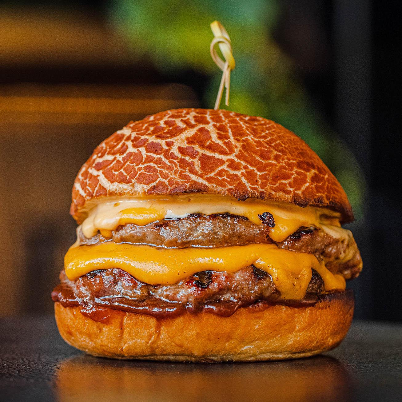 Бургер с двойной котлетой из говядины, маринованным огурцом, сыром чеддер, сырным соусом и барбекю