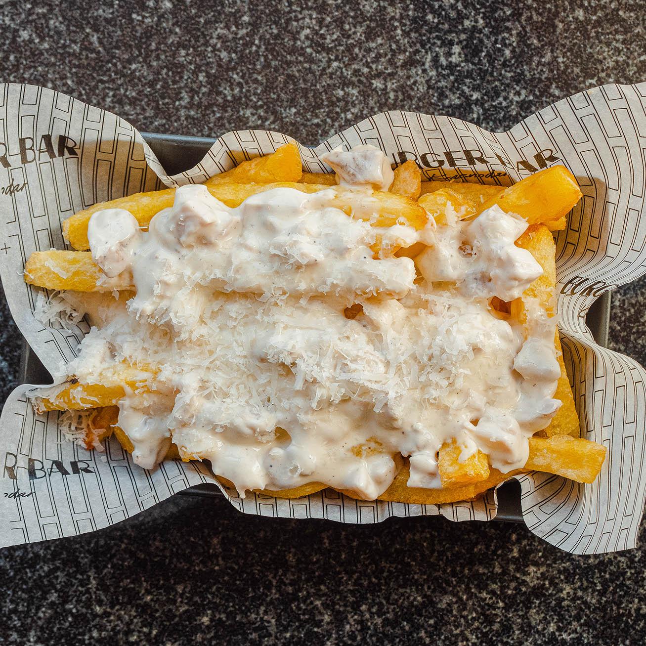 Картофель двойной обжарки, с сочной курицей дорблю. Под сыром пармезан