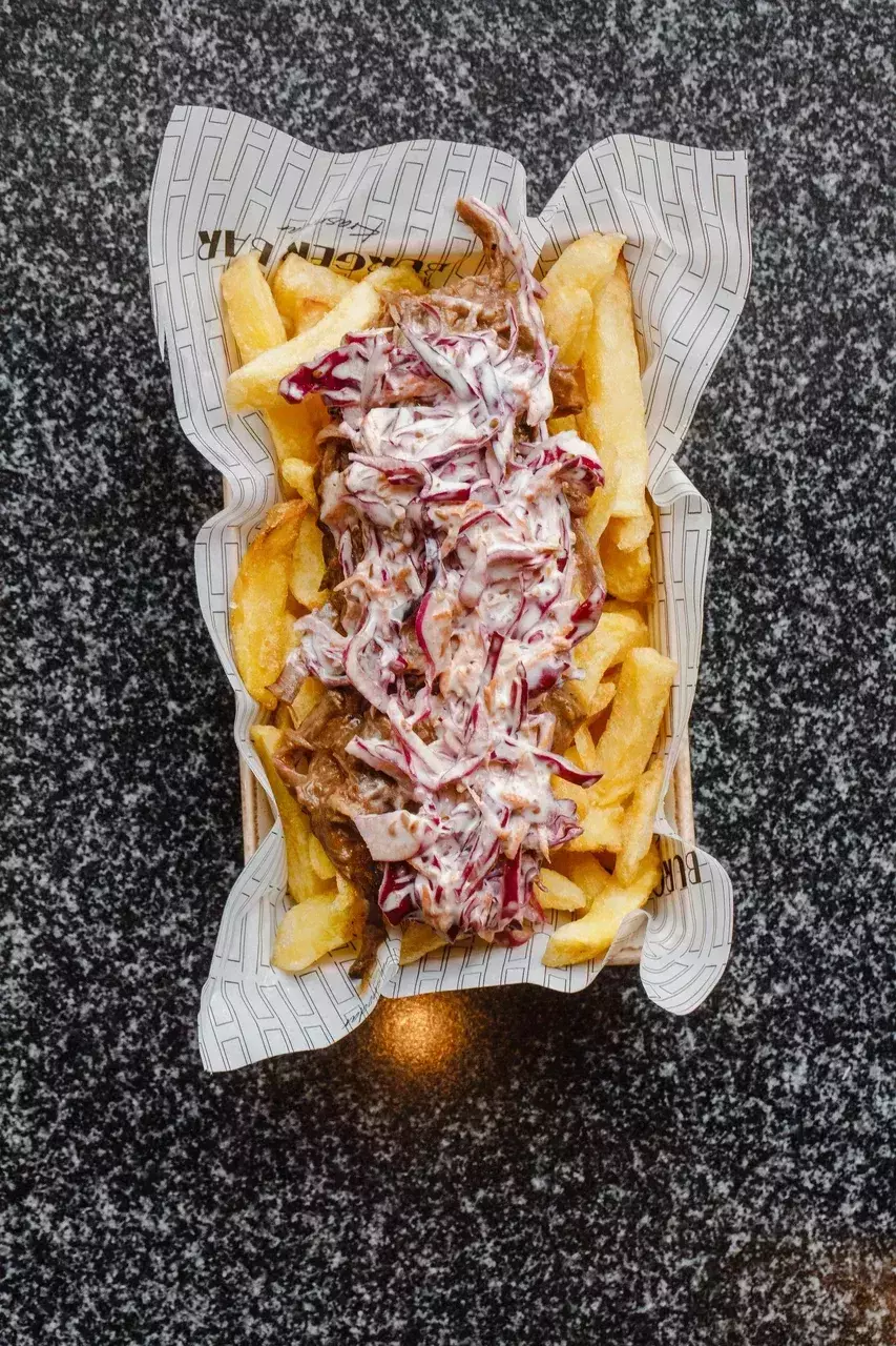 Картофель с сочной, маринованной рваной говядиной. Подается под хрустящим салатом коул-слоу