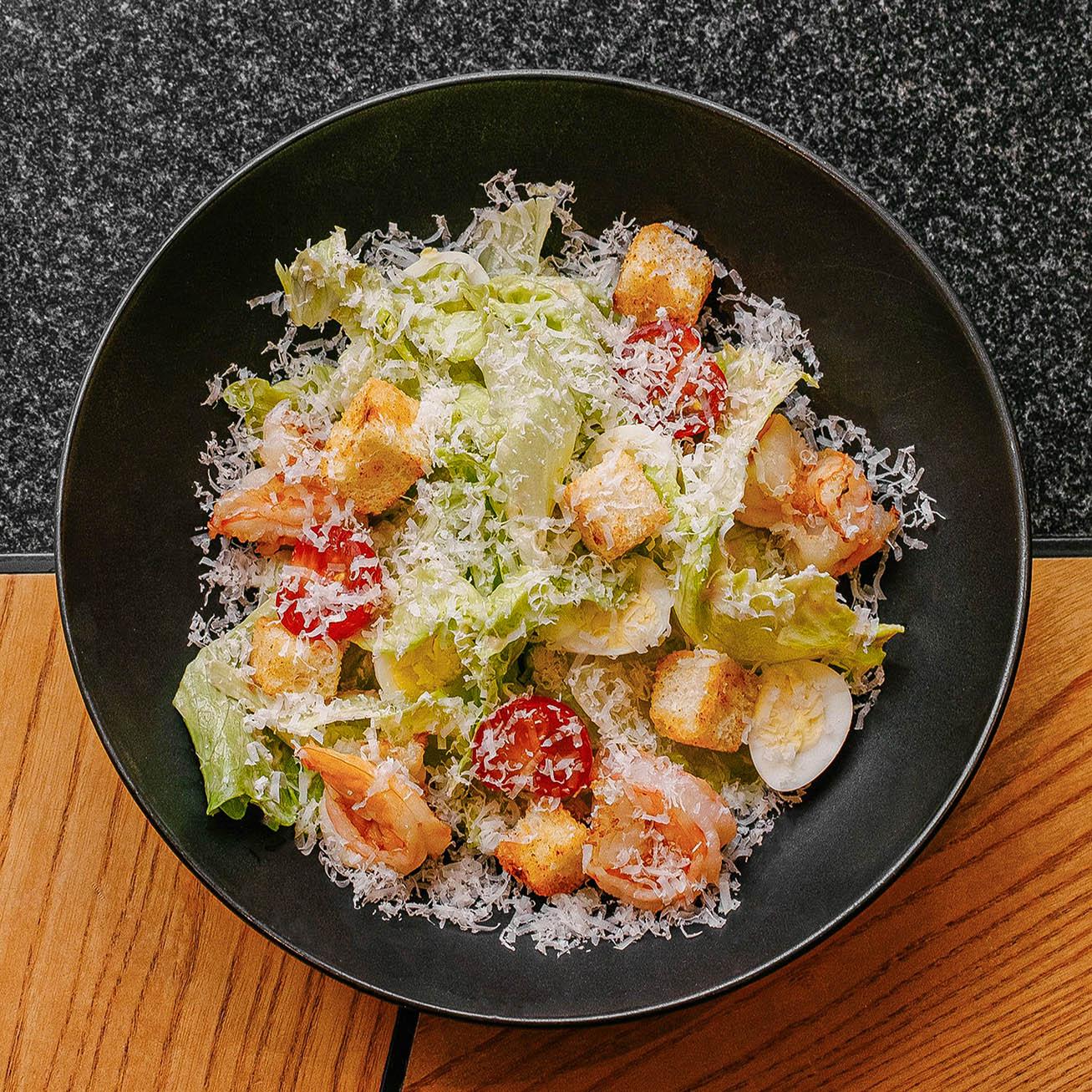 Классический цезарь с креветками с добавление сухариков из нашей фирменной тигровой булочки